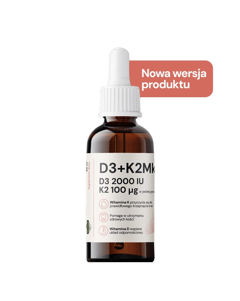 Jedna kropla zawiera 400 IU D3 oraz 20µg K2 Mk-7.