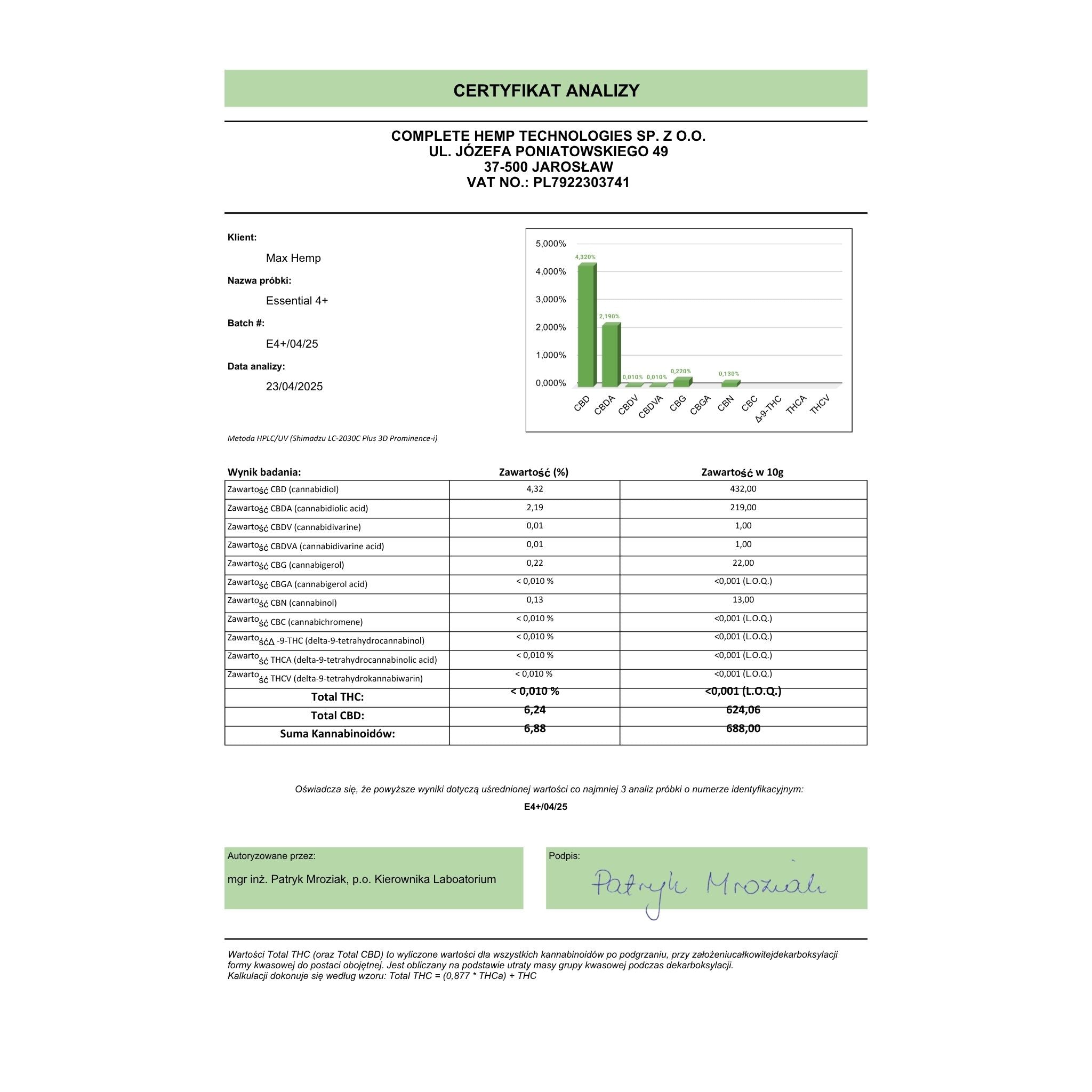 Ekstrakt full spectrum z konopi siewnych Max Hemp ESSENTIAL 4+ to produkt polecany szczególnie dla osób stosujących CBD w celach profilaktycznych.