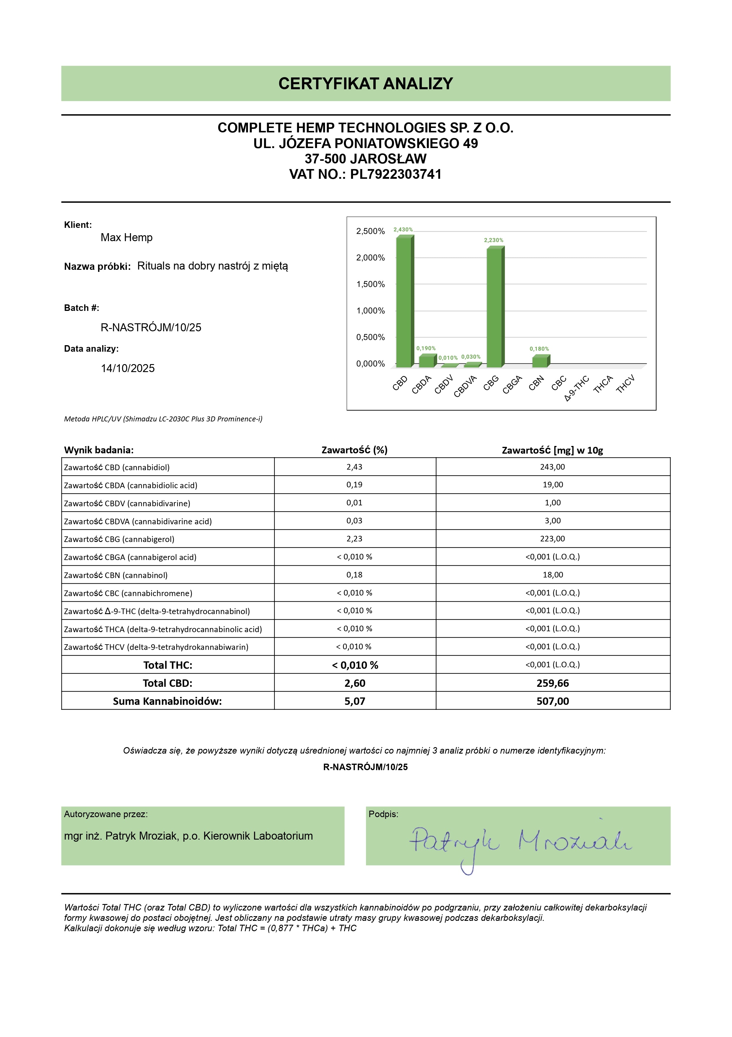 - Ekstrakt z konopi siewnych (Cannabis sativa L.) z ekstrakcji hybrydowej – w takiej ilości, która sumarycznie powoduje zawartość min. 200mg CBD i 200mg CBG w każdej buteleczce