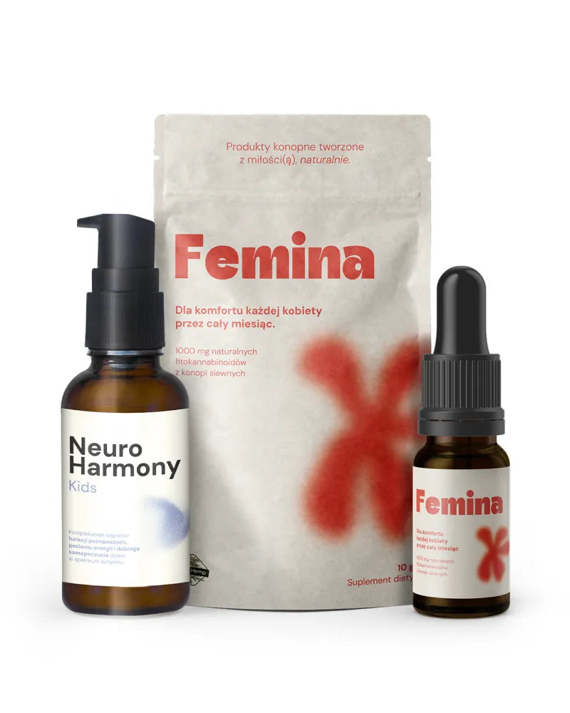 Olejek Max Hemp® Femina to ekstrakt z konopi siewnych (Cannabis sativa L.) przeznaczony dla wsparcia dobrego samopoczucia każdej kobiety, przez cały miesiąc i w każdym dniu cyklu. Odmiany konopi, z których powstał, są cennym źródłem naturalnych substancji takich jak fitokannabinoidy i terpeny. Unikatowy profil terpenowy olejku powoduje, że produkt ten doskonale sprawdza się jako naturalne wsparcie dobrostanu każdej kobiety.